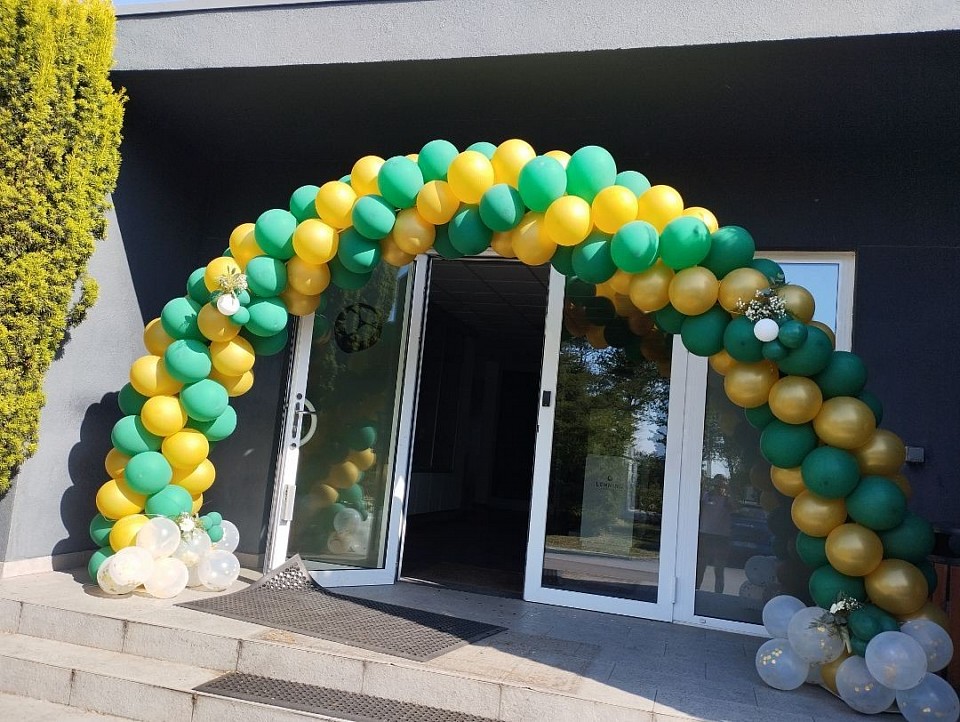 J’ai eu la chance de concevoir l’ensemble de la décoration : une arche de ballons accueillant les invités, une scène extérieure habillée d’une arche ronde, ainsi que des centres de table, des colonnes et pleins d'autres belles choses harmonisés autour des teintes vert, or et blanc,les couleurs emblématiques de l’évènement.